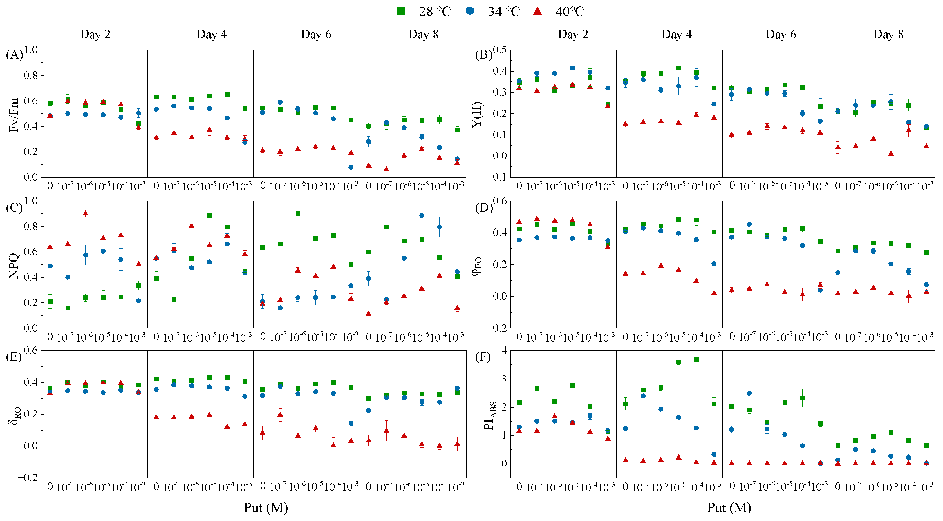 At moderate temperatures (28 °C and 34 °C), optimal Put concentrations significantly enhanced photochemical efficiency. Specifically, at 28 °C, 10−5 M Put on Day 2 increased PIABS and φEO by 27.65% and 7.14%, respectively. At 34 °C, 10−7 M Put on Day 8 elevated Fv/Fm by 53.57% relative to the control. These enhancements indicate Put-mediated stabilization of PSII and improved electron transport efficiency. Under extreme thermal stress (40 °C), the functional role of Put shifted toward photoprotection. Notably, 10−4 M Put increased NPQ and δRO by 24.96% and 19.92% compared to the control, respectively, on Day 2, indicating enhanced thermal dissipation of excess excitation energy and sustained QA reoxidation beyond PSII. This direct evidence of preserved and enhanced δRO and NPQ under Put treatment at 40 °C provides the functional explanation for the sustained carbon fixation observed despite chlorophyll loss in Figure 2F. Y(II) was also partially maintained under this treatment, suggesting that Put preserved a fraction of PSII photochemical efficiency despite heat-induced damage.