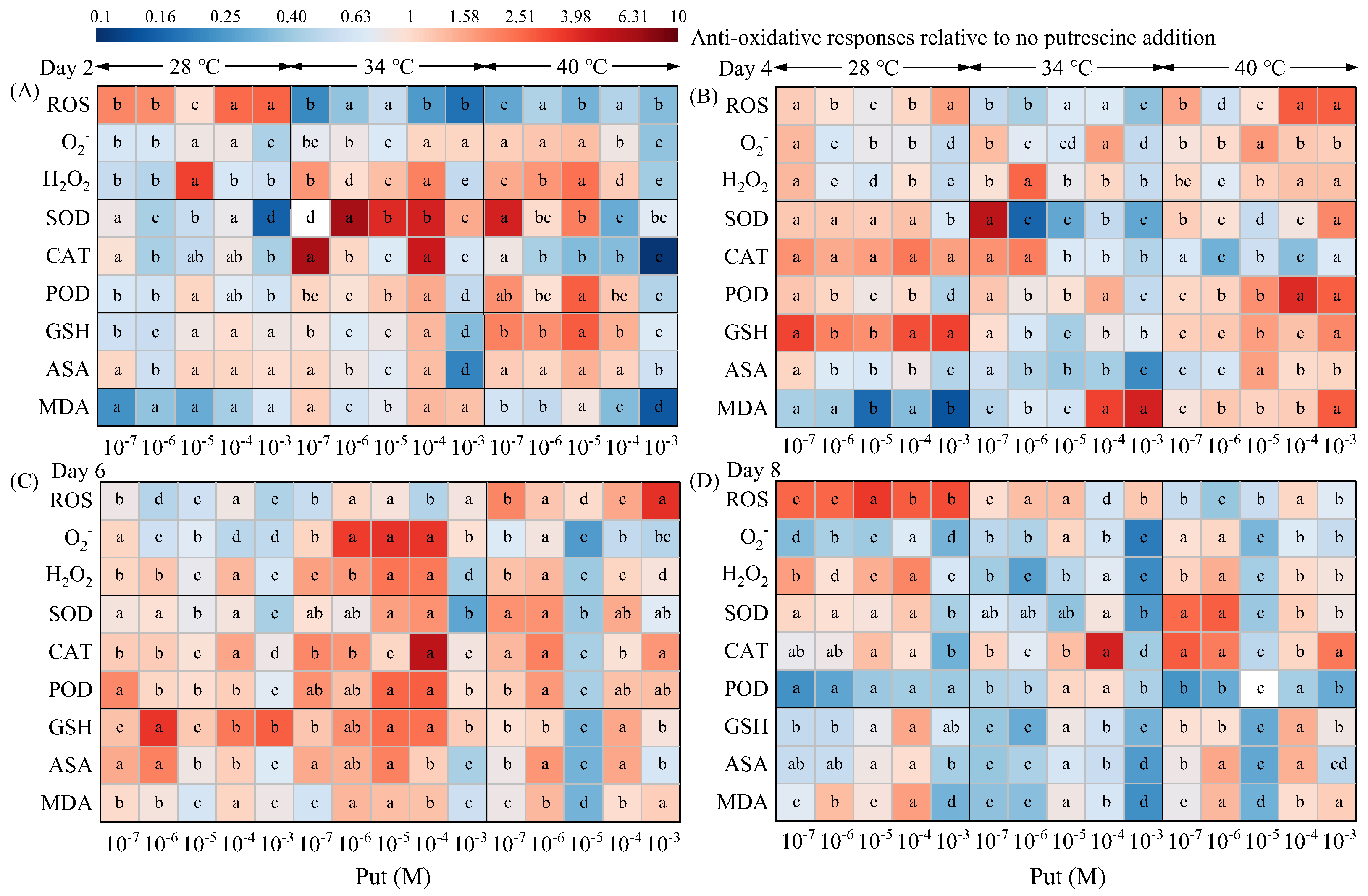 At 40 °C, antioxidant defenses were rapidly overwhelmed despite early antioxidant defense system activation. On Day 2, 10−7 M Put increased SOD (5.02-fold), POD (2.19-fold), GSH (2.38-fold), and ASA (1.37-fold) levels and reduced ROS (by 76.72%) and MDA (by 25.76) levels. However, by Day 4, MDA levels in the 10−7 M Put treatment had risen by 8.97% relative to the control, indicating that Put had shifted from acting as an antioxidant to functioning as a pro-oxidant.