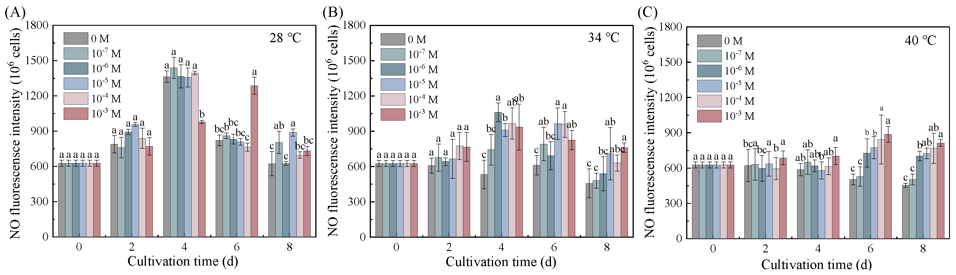 Under extreme thermal stress (40 °C), the functional consequence of the temperature–Put interaction shifted, with 10−7 M Put inducing only a transient NO elevation (an 8.05% increase on Day 2), insufficient to sustain protective responses. Thermal disruption of NO synthase systems likely caused a collapse of the Put–NO signaling network, culminating in progressive NO decline through Day 8.