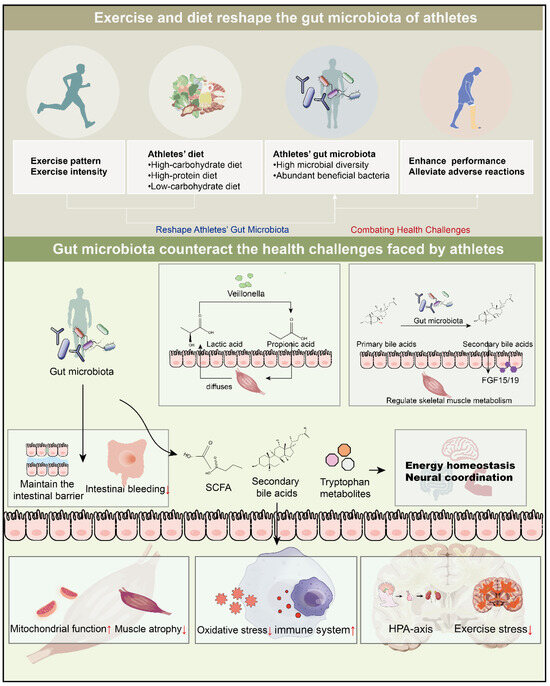 This review presents strong evidence that athletes’ gut microbiota is a dynamic and functional ecosystem shaped by the combination of specialized exercise and tailored diets. Specific exercise and nutrition selectively foster a diverse microbial community rich in health-promoting bacteria. This adaptively modulated microbiota impacts the host through key mechanisms. The gut microbiota thus emerges as a crucial link between external interventions and internal physiological states, showing great potential for targeted modulation. Future research should rely on standardized cohorts, controlled environments, and multi-omics integration to clarify causal mechanisms and find functional microbial strains. A better understanding and precise intervention of the gut microbiota will drive sports nutrition and training strategies into a new, microbe-guided paradigm. This will open up a new way to improve athletic performance and protect athletes’ long-term health.