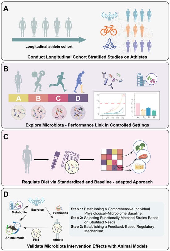 Suggested framework for future research. It encompasses the following four aspects. (A) Long-term longitudinal cohort studies are conducted on athletes. Stratify athletes by sports event characteristics (e.g., endurance, strength, high-intensity interval training). Develop microbiota research plans for different sports, standardize variables of sport types and intensities to observe gut microbiota changes and clarify mechanisms. (B) Exploration in a controlled environment. Research in controlled settings like training bases or labs. Regulate diet, exercise intensity, and routine. Monitor gut microbiota and sports performance long-term to build a dynamic model. Regularly check key microbial taxa and metabolites, adjust training based on results, and use markers for over-training warning. (C) Precise diet regulation. Adopt “standardized assessment + gut microbiota baseline adaptation” for diet control. Evaluate acute and habitual intakes, quantify diet quality, and analyze nutrient effects on gut microbiota. Provide personalized diet advice according to sports type, microbiota baseline, and metabolic phenotype to analyze exercise’s independent influence. (D) Animal model construction for causal verification. Build animal models mimicking athletes’ physiological states. Apply microbial manipulation strategies. Monitor performance changes during exercise. Use multi-omics to identify performance-related microbial taxa and metabolites and clarify molecular mechanisms.