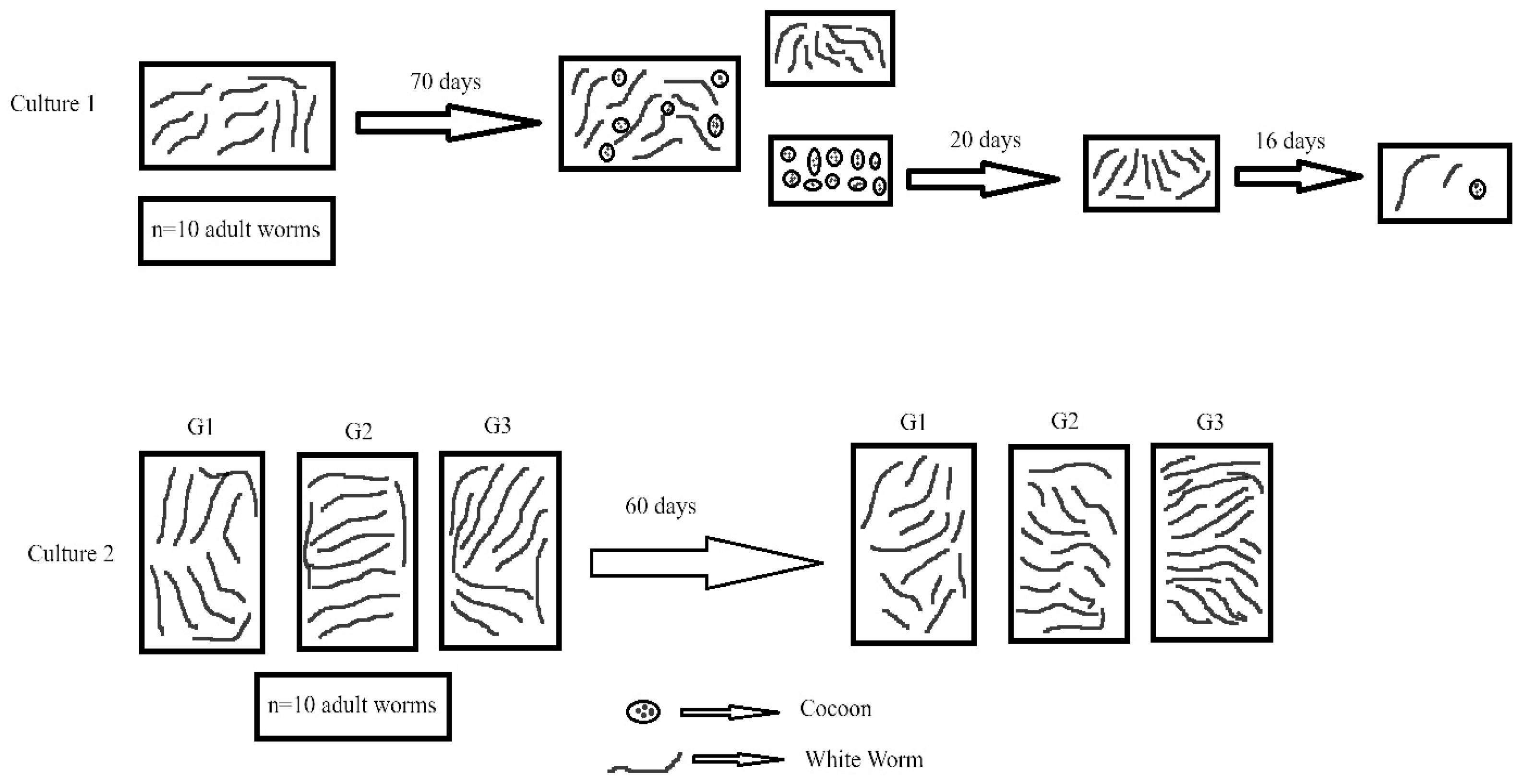 | Adult Worms Mean Length (mm) (n = 10) | Adult Worms Mean Weight (g) (n = 10) | Total Weight (g) of Individuals (n = 424) on Day 70 | Numbers of New Individuals Hatched from Cocoons on Day 90 (Number) * |