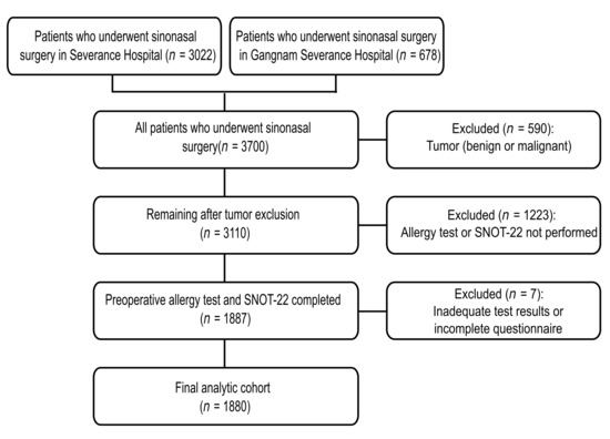 We conducted a multicenter retrospective cohort study of patients with CRS, with or without nasal polyposis, who underwent sinonasal surgery at two tertiary hospitals (Severance Hospital and Gangnam Severance Hospital). All patients who underwent sinonasal surgery were screened. The study period was from 1 March 2020 to 27 August 2025. Of the 3700 surgical cases (Severance Hospital, n = 3022; Gangnam Severance Hospital, n = 678), 590 with benign or malignant sinonasal tumors were excluded, leaving 3110 eligible cases. Among these, 1887 patients who underwent both preoperative allergy testing and completed the SNOT-22 questionnaire were included, and 1223 patients who did not undergo both tests were excluded. An additional seven patients with inadequate test results or incomplete questionnaires were excluded, yielding a final analytical cohort of 1880 patients (Figure 1). All index measures (specific IgE and SNOT-22) were obtained preoperatively within 1 year of surgery; when multiple preoperative assessments were available, the first preoperative evaluation was chosen for subsequent analysis. The study complied with the Declaration of Helsinki and was approved by the Institutional Review Board of Yonsei University College of Medicine (IRB 4-2025-1287). The requirement for informed consent was waived because of the retrospective nature of the study, and all data were anonymized using IRB-approved procedures.