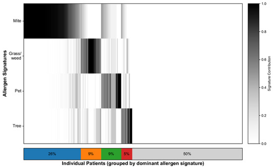 Allergen signature deconvolution and distribution. Heatmap showing 35-allergen sensitization per patient, ordered by dominant signature. The stacked bars summarizes the proportion of patients in each dominant signature group, where blue represents Mite, orange represents Grass/weed, green represents Pet, red represents Tree, and gray represents the Nonallergic group.