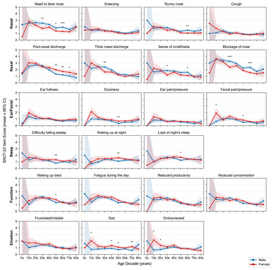 Age- and sex-stratified SNOT-22 item means. Grid of line plots by decade and sex with 95% confidence intervals (CIs); items are grouped by domains. Asterisks above points indicate statistically significant differences between sexes within that age decade (* p < 0.05, ** p < 0.01, *** p < 0.001; false discovery rate [FDR]-corrected). SNOT-22, 22-item Sino-Nasal Outcome Test.