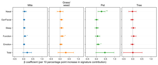 Models adjusted for age, sex, and comorbidities yielded selective associations at the domain level (Figure 5). The Pet signature was associated with the Nasal domain subscore (β = 0.2811, p = 0.00547) and Emotion domain subscore (β = 0.0912, p = 0.0400). Both the Mite and Grass/weed signatures were associated with the Function domain (β = 0.0654, p = 0.0374; β = 0.1097, p = 0.0318, respectively). The Tree signature showed no significant domain-level associations (p < 0.05).