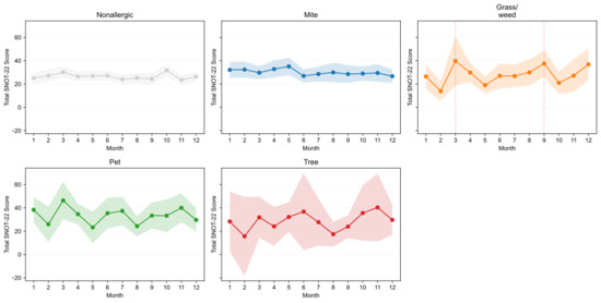 The average monthly SNOT-22 scores were compiled based on the dominant allergen signature (Figure 6). Hereafter, “seasonal variation” is defined as the coefficient of variation (CV) of monthly mean SNOT-22 scores—(standard deviation of monthly averages ÷ annual average) × 100%—with larger CV indicating greater seasonality. Patients without allergic sensitization exhibited minimal seasonal changes (annual average 26.52; CV 9.06%). Patients with mite sensitization showed winter–spring predominance with low variability (average 30.13; CV 8.39%). Patients with grass/weed sensitization had the greatest seasonal variation (average 27.97; CV 27.41%), with a bimodal pattern peaking in March (39.73, +42% compared with the average) and September (37.56, +34%). Patients with pet-dominant sensitization had the highest absolute symptom burden throughout the year (average 33.46; CV 20.41%), with peaks in January (38.28), March (46.35), July (37.31), and November (40.00) and the lowest in May (23.22). Patients with tree-dominant sensitization showed notable variability (average 28.62; CV 26.10%), with peaks in June (36.75) and October–November (35.57–40.33) and a low in February (15.60). Overall, relative seasonal variation was most pronounced for grass/weed and tree sensitizations, moderate for pet sensitization, and minimal for mite and nonallergic groups, whereas absolute symptom burden ranked as pet > mite > tree ≈ grass/weed > nonallergic, aligning with exposure ecology.