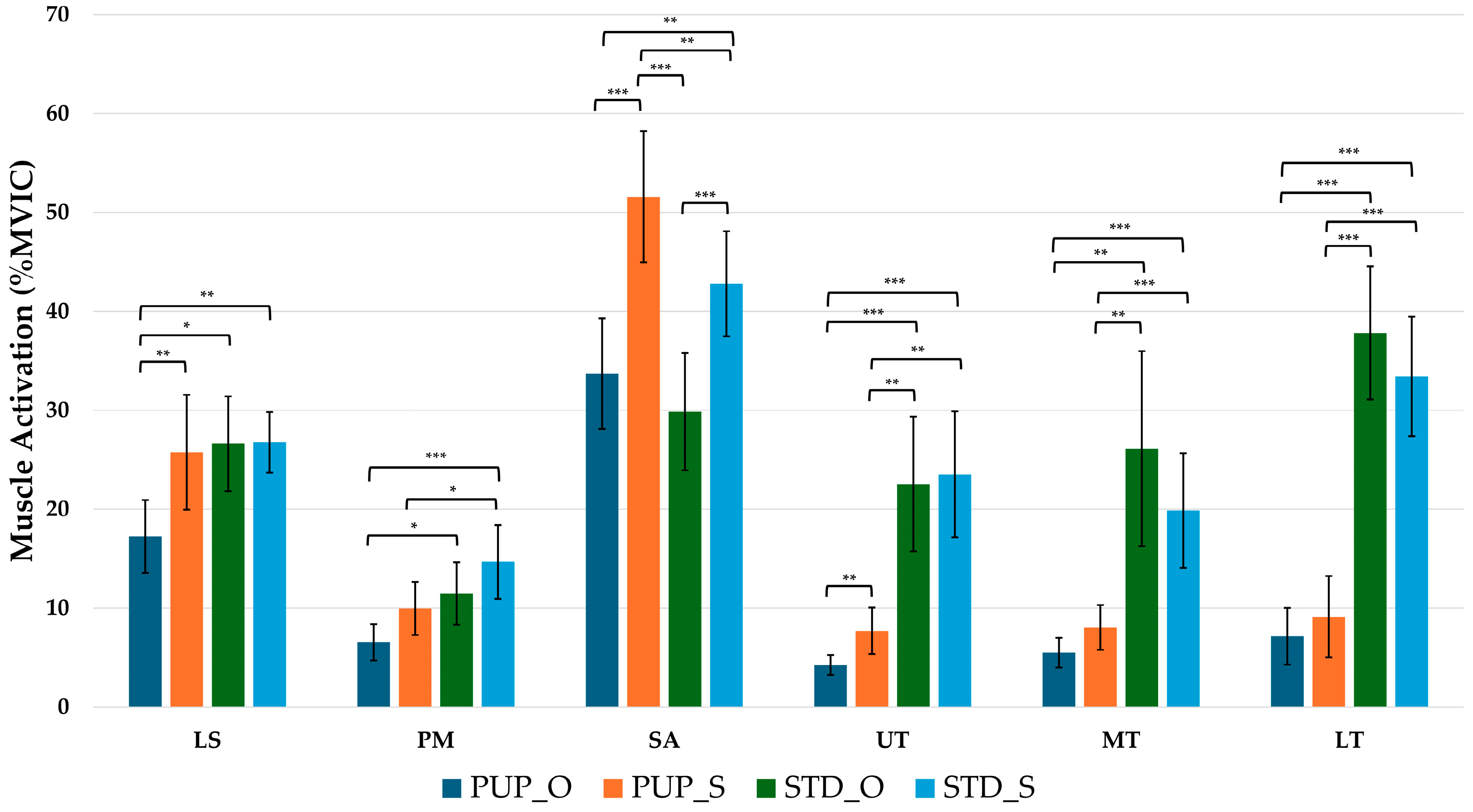 3.2. Muscle Activation During the Scapular Isometric Phase
