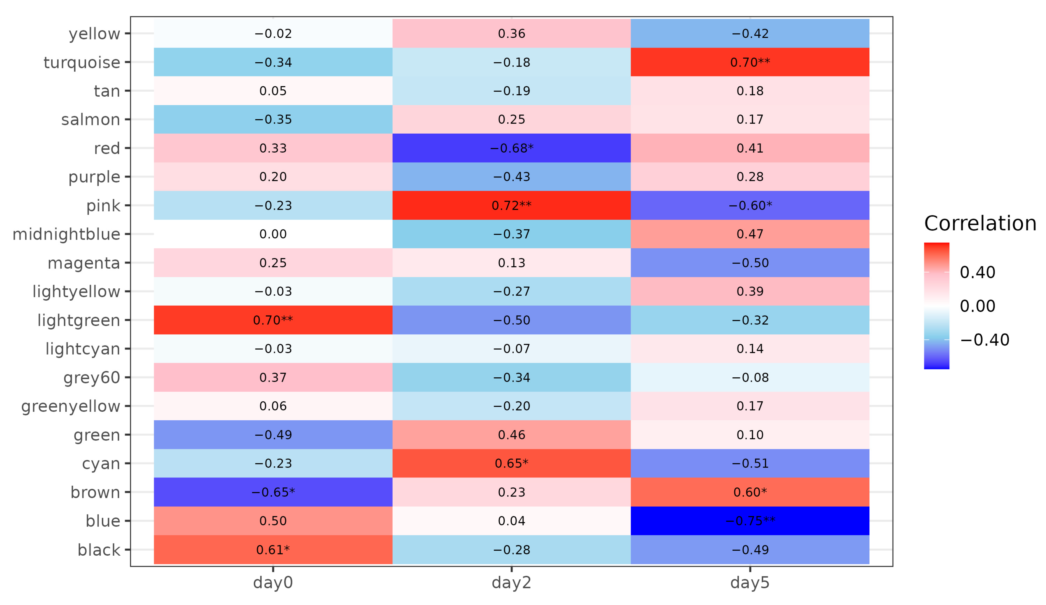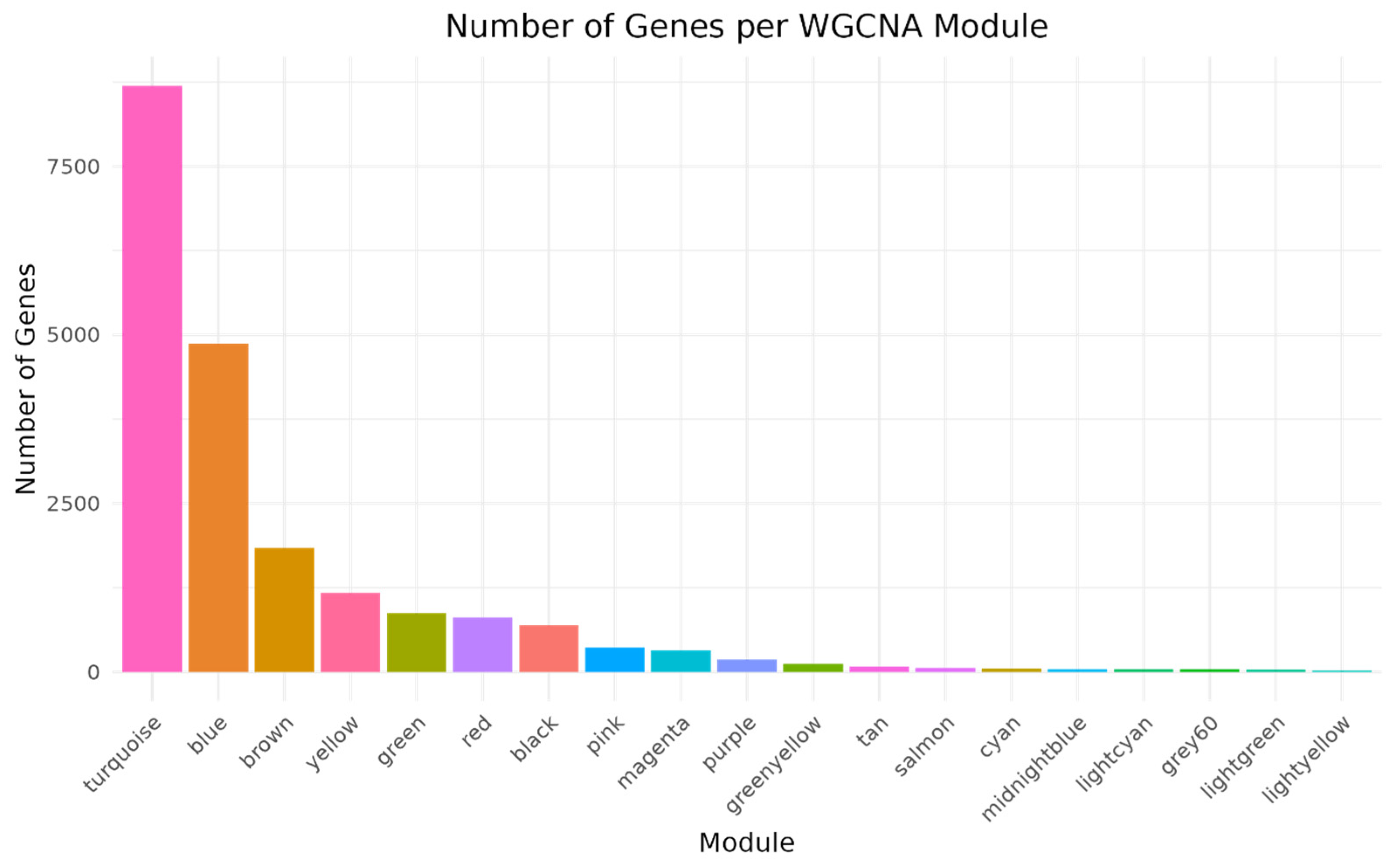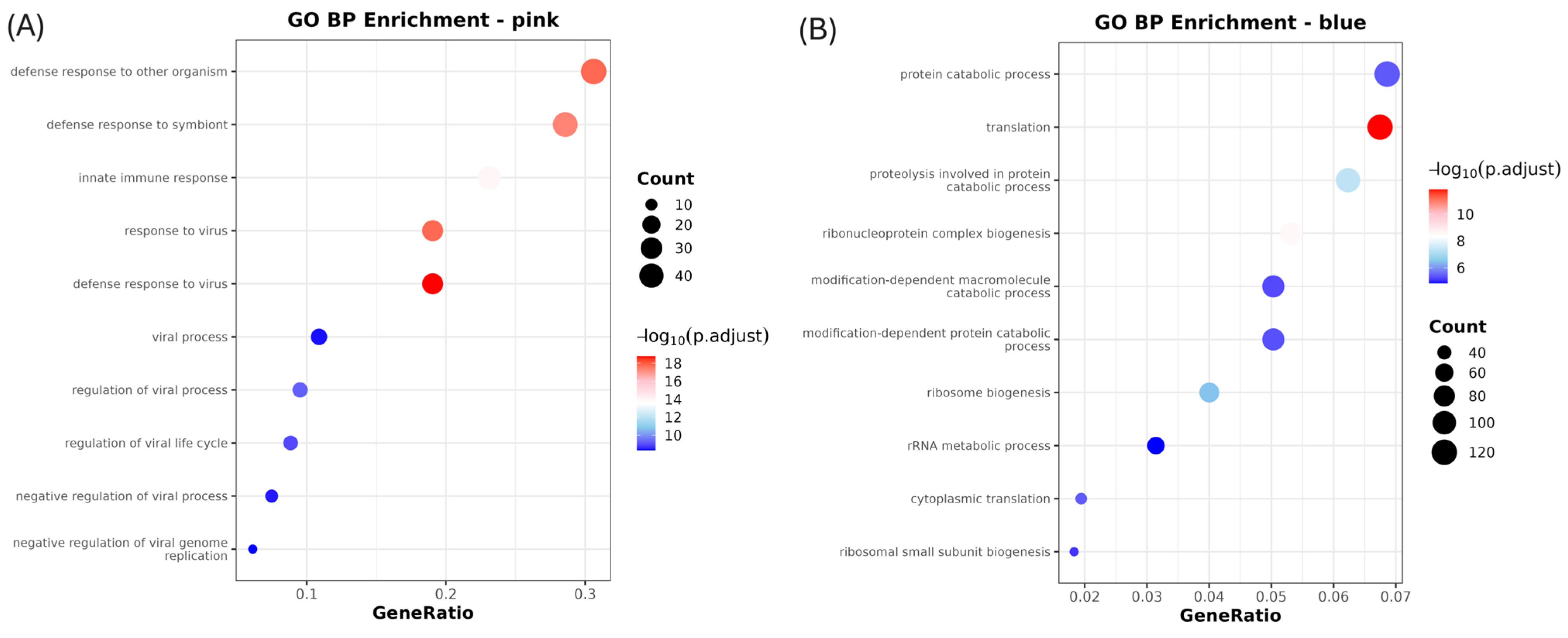 2.4. Functional Enrichment Analysis of Gene Co-Expression Modules