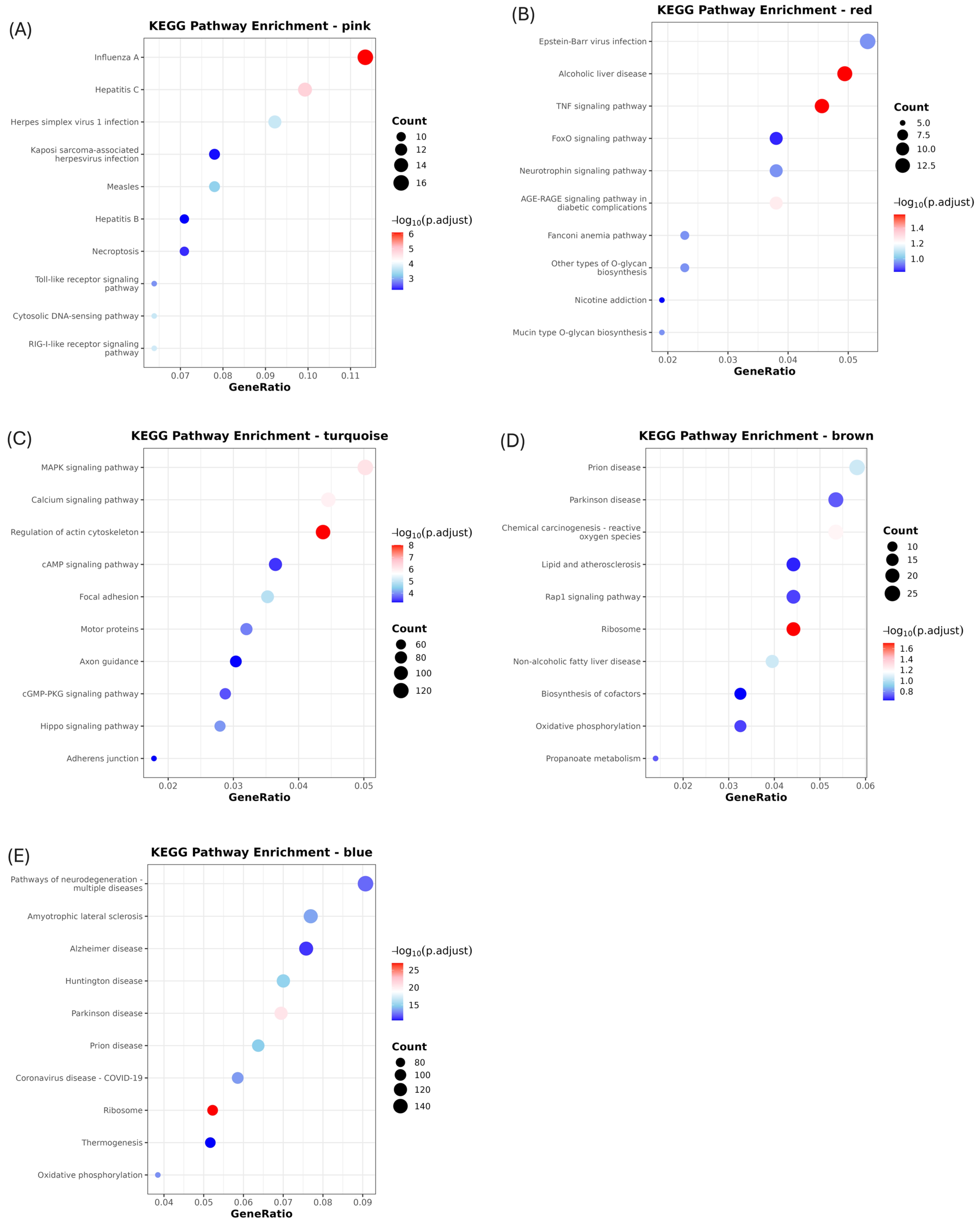 | Module | Enriched KEGG Pathway and Gene Ontology (Biological Process) Terms | Adjusted p-Value | Genes |