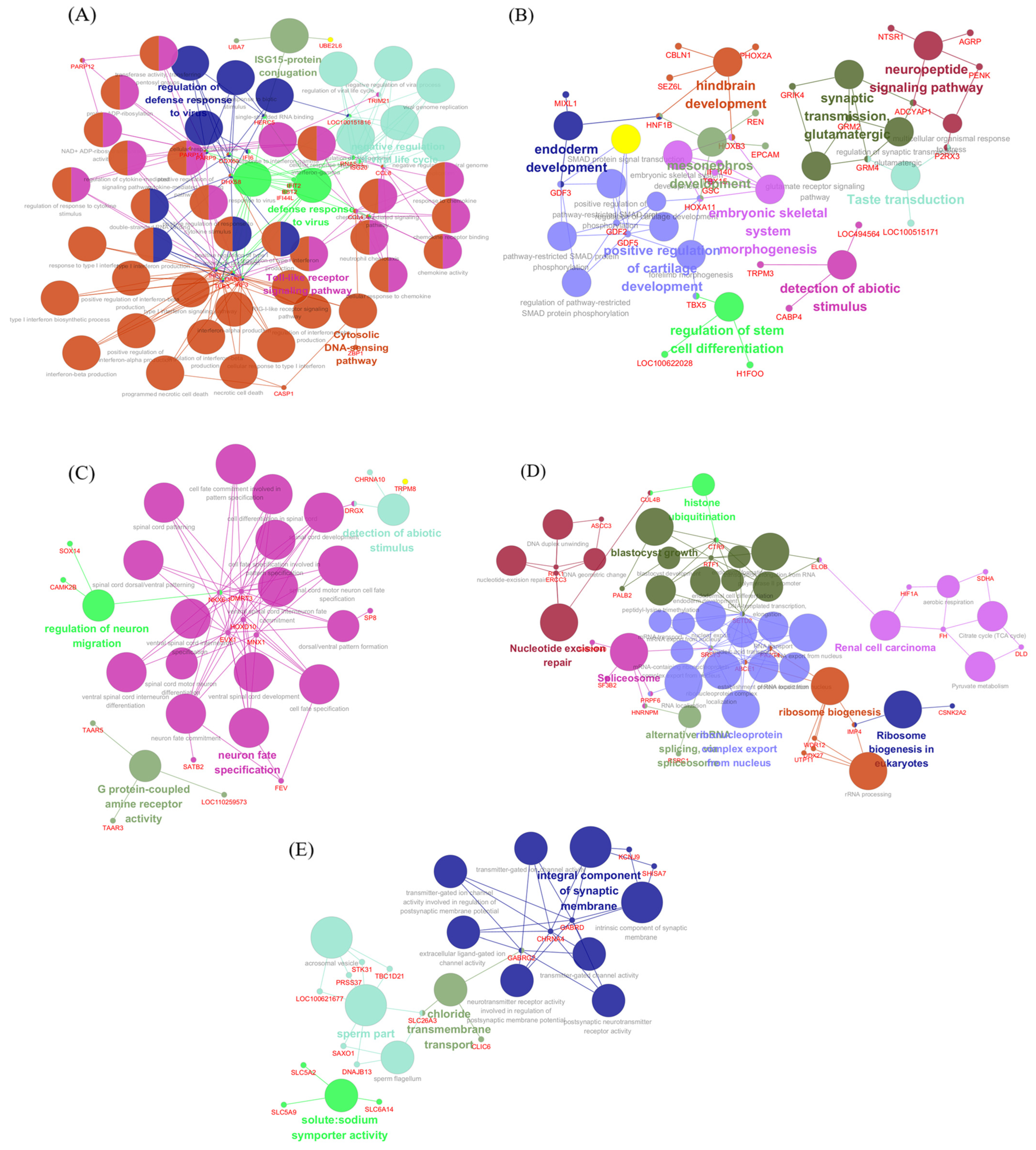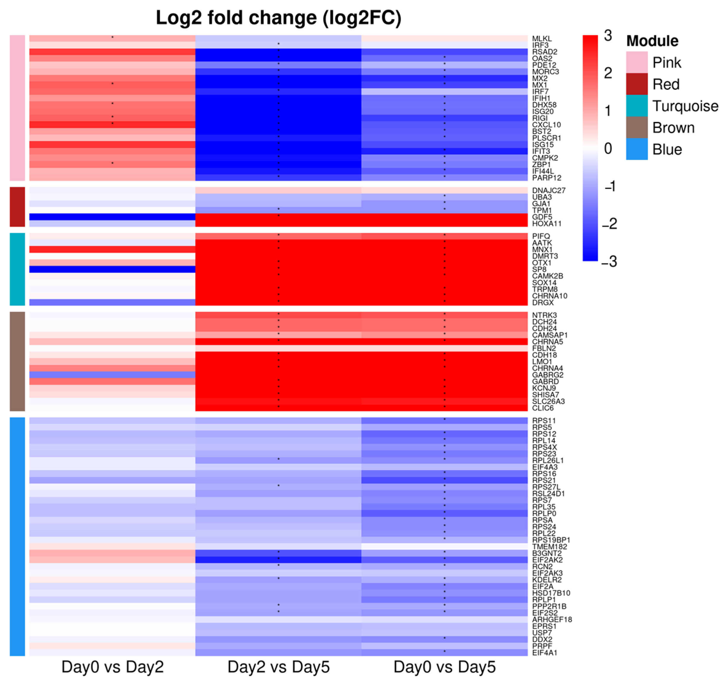 | Pink | Influenza A Hepatitis C necroptosis RIG-I-like receptor signaling Toll-like receptor signaling cyt solic DNA sensing pathway defense response to virus (GO:0051607) innate immune response (GO:0045087) response to virus (GO:0009615) | 8.11 × 10−7 1.39 × 10−5 1.30 × 10−3 1.67 × 10−4 1.30 × 10−3 1.90 × 10−4 1.73 × 10−18 1.69 × 10−13 1.66 × 10−17 | MLKL, IRF3, RSAD2, OAS2, OASL, PDE12, MORC3, MX2, MX1, IRF7, IFIH1, TRIM65, DHX58, ISG20, RIGI (DDX58), CXCL10, BST2, PLSCR1, ISG15, IFIT3, ZBP1, IFI44L, PARP12, CMPK2 |
