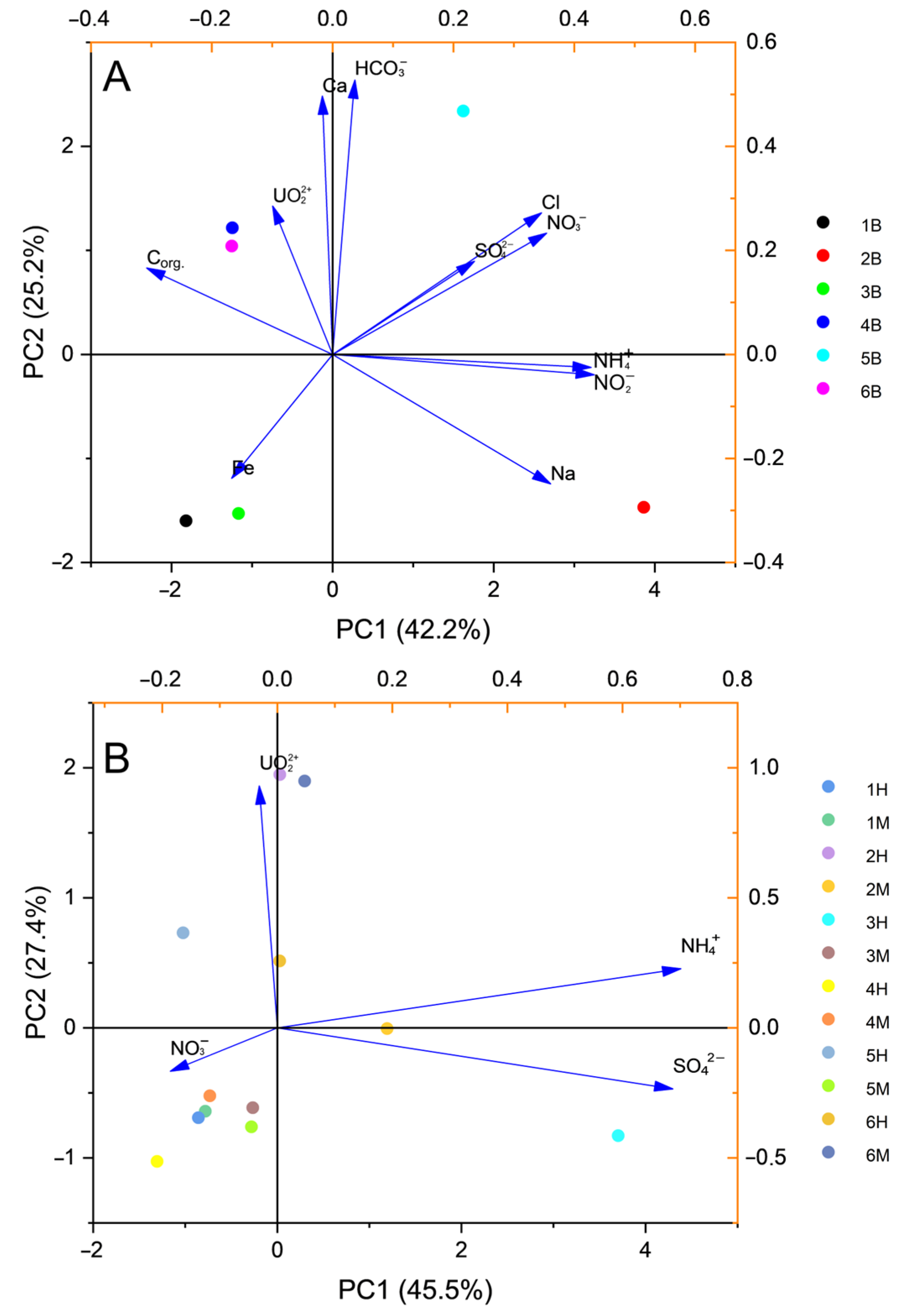 | pH | eH | C/C | NO3− | NO2− | HCO3− | SO42− | NH4+ | Ca2+ | U | Corg. | Na | Cl | Fe | |