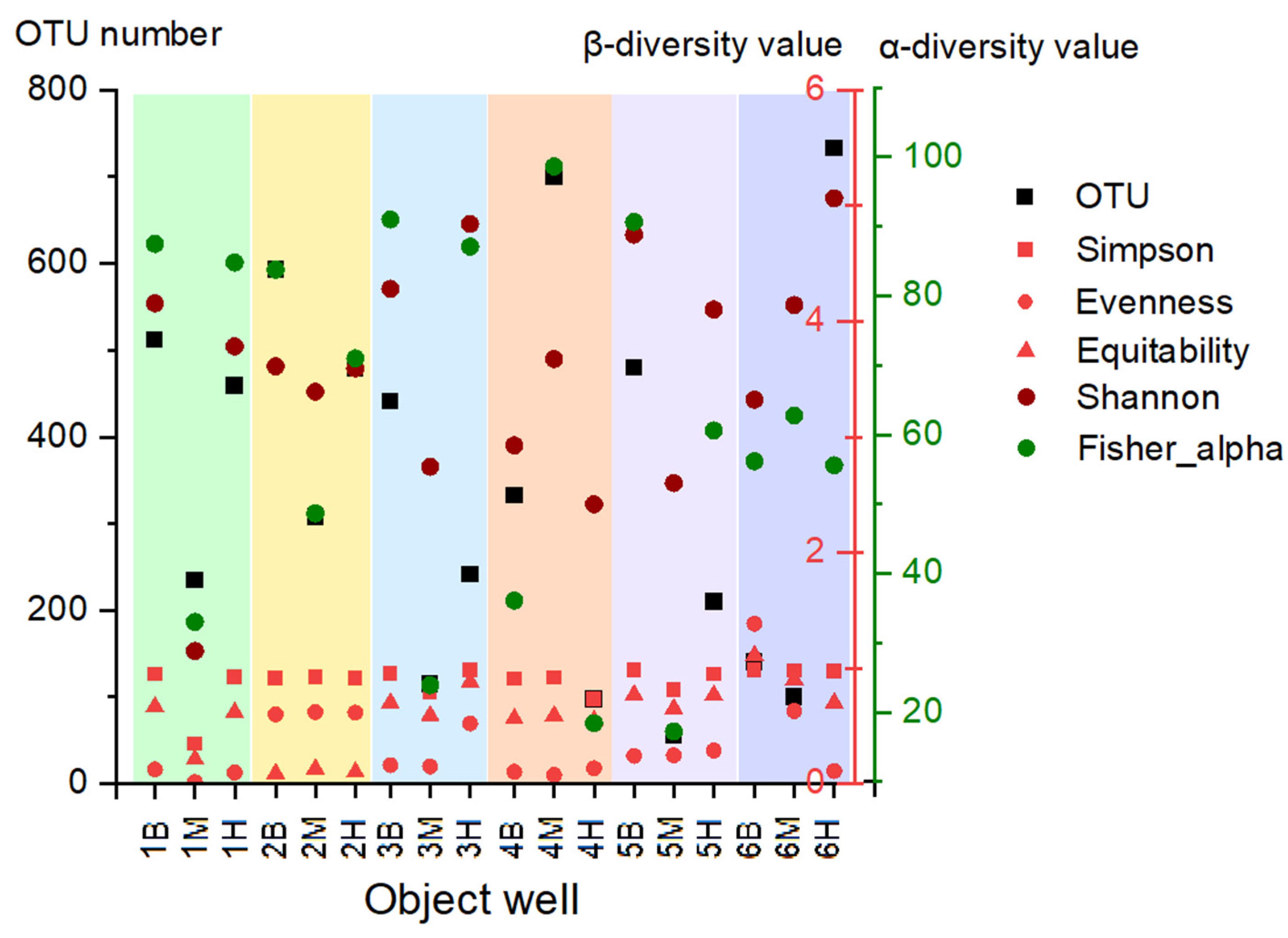 | OTU | 28.194 | 3.67 × 10−7 * | 0.758 | B > M, B > H, M < H (p < 0.01) |