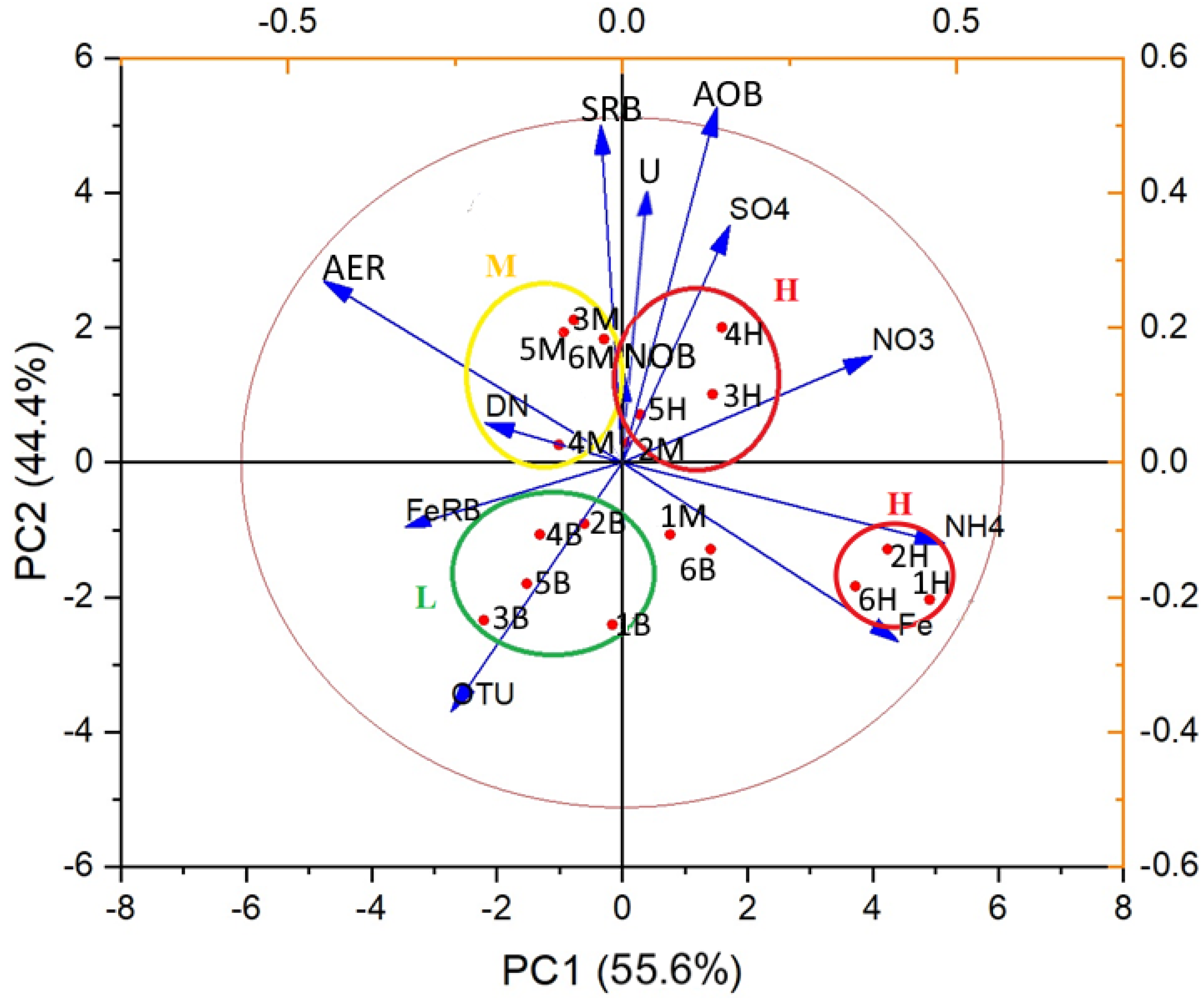 | NO3− | 45.217 | 2.14 × 10−9 * | 0.834 | B < M < H (p < 0.001) |