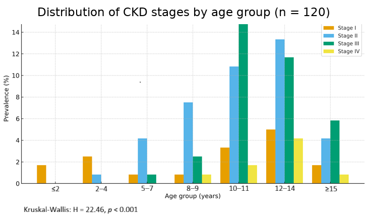 Table 3. The majority of CKD cases occurred in cats aged 10–14 years, corresponding to the highest-risk period for disease manifestation. The incidence increased progressively with age, confirming the degenerative nature of CKD.