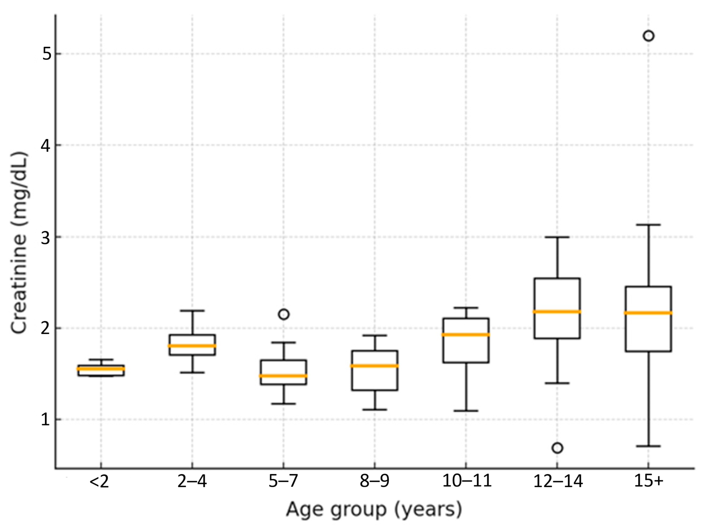 Figure 8) across age groups revealed a progressive, non-linear increase with advancing age. Median values rose from 1.8 mg/dL [IQR 1.4–2.2] in cats younger than seven years to 3.8 mg/dL [IQR 2.9–5.1] in cats aged twelve years or older. The median difference between these two age categories was 2.0 mg/dL (95% CI: 1.3–2.6; Mann–Whitney U = 214.5,
