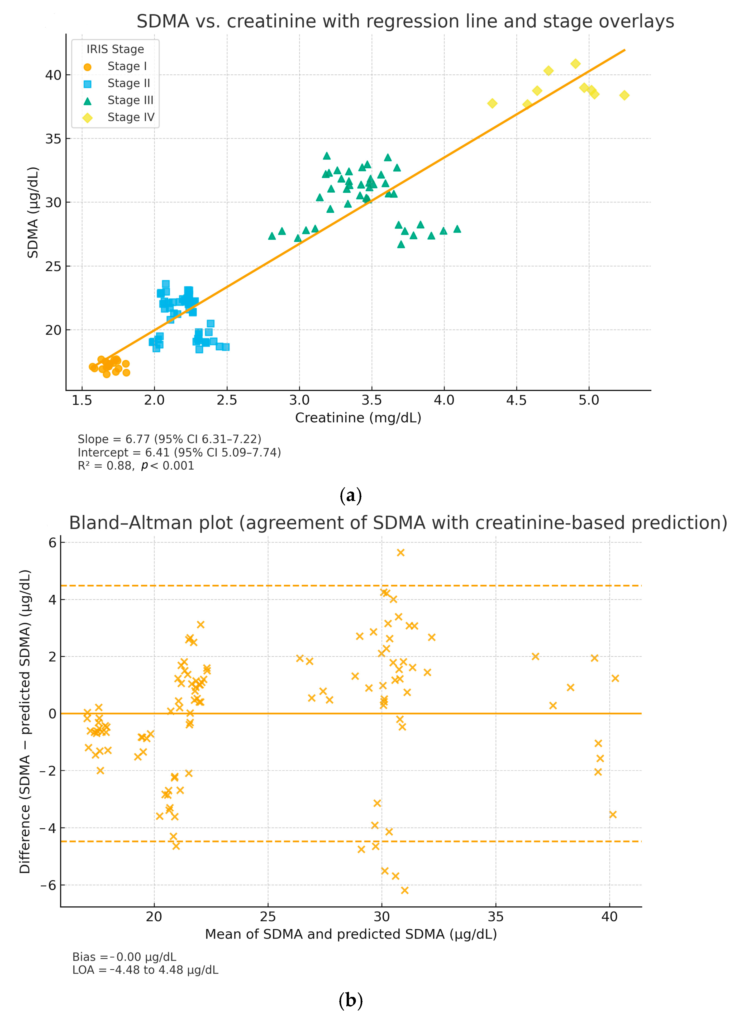 2 = 0.88) supports the concurrent use of both biomarkers. SDMA increases even with mild GFR decline and thus offers a valuable diagnostic window before overt azotemia develops [