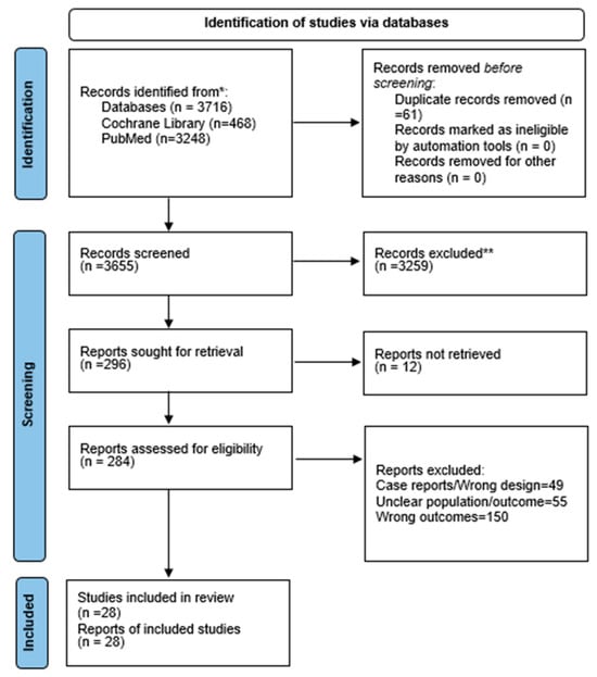 PubMed and the Cochrane Library were used for a comprehensive literature review. The Cochrane Library found 468 records, whereas PubMed found 3248. The titles and abstracts of 3655 articles were reviewed after EndNote X9 had removed 61 duplicates. After screening, 296 full-text articles were assessed for eligibility. Twelve studies were found to be unrecoverable. A total of 205 papers were removed for inappropriate results or demographics, and 51 for improper study design. The final synthesis included 28 studies. The PRISMA flow diagram (Figure 1) shows the screening process.
