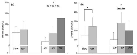 The results of muscle activation (%RVC) at different distances and speed conditions: (a) Main effect of RF (b) Main effect of GA. * significant difference found between the speeds (p < 0.05); # significant difference found between the distance (p < 0.05).