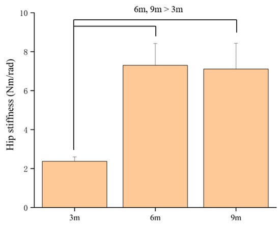In the eccentric phase, hip stiffness showed a significant main effect of distance (p = 0.001), with post hoc analysis indicating that the longer approaches resulted in significantly higher hip stiffness compared to the shortest approach (Figure 8). Ankle stiffness was the only joint to exhibit a significant three-way pattern: a significant interaction (p = 0.003).