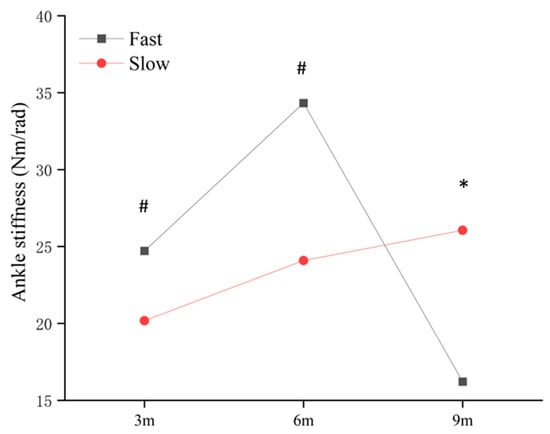 The simple main effect of distance and speeds on eccentric ankle stiffness. * significant difference found between the speeds (p < 0.05); # significant difference found compared with 9 m (p < 0.05).