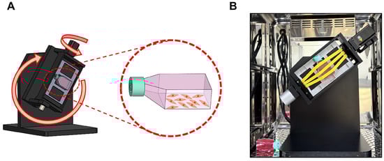 The 3D clinostat (version 2; Yonsei Academy of Science, Biophysics, and Medical Engineering Institute, Seoul, Republic of Korea) [26] was designed with two orthogonal rotation axes, enabling continuous changes in the direction and magnitude of gravity to simulate a microgravity (SMG) environment (Figure 1A,B). The rotation pattern, speed, and duration were controlled using software, and the device was rotated at 5 rpm for either 24 or 72 h. To validate that the 3D clinostat rotation at 5 rpm accurately generates a simulated microgravity environment, we performed SMG experiments at the same angular velocity using the same clinostat system in our previous work [27]. In that study, the microgravity condition produced by 5 rpm rotation was experimentally verified, and computational modeling demonstrated that the centrifugal acceleration experienced inside a T-flask (40.4 mm × 73.7 mm × 22.8 mm) ranged from approximately 0.0013 g at the flask edge to 0 g at the center, consistent with established SMG parameters.