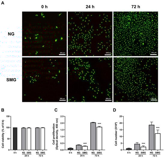 The CCK-8 assay (Dojindo, Kumamoto, Japan) was used to measure cell proliferation following SMG exposure. Cells were washed once with DPBS, and treated 10% CCK-8 solution in culture medium directly within the same T-12.5 culture flasks used for the experiment, without reseeding onto another culture plate and incubated for 1 h at 37 °C in a 5% CO2 incubator under dark conditions. The absorbance was measured at 450 nm using a microplate reader (VERSAmax, Sunnyvale, CA, USA). Importantly, the cells were not detached or re-seeded into a separate microplate for this assay. Proliferation was assessed directly in the same 12.5T flasks that were used for NG or SMG exposure, without any intermediate transfer steps, in order to avoid disturbing cell adherence or altering proliferative behavior. All proliferation data were obtained from three independent biological replicates, each derived from separately cultured and individually SMG-exposed flasks.