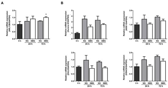 mRNA expression analysis was performed for ARL13B (a marker of cilia assembly) and Aurora A, NDE1, HDAC6, and DVL2 (disassembly-related genes) to explore whether SMG alters the primary cilia dynamics. At 24 h, ARL13B increased to 1.12-fold in NG and 1.41-fold in SMG relative to 0 h. At 72 h, ARL13B remained elevated (1.27-fold in NG and 1.46-fold in SMG), supporting a trend toward enhanced cilia assembly under SMG (Figure 4A).