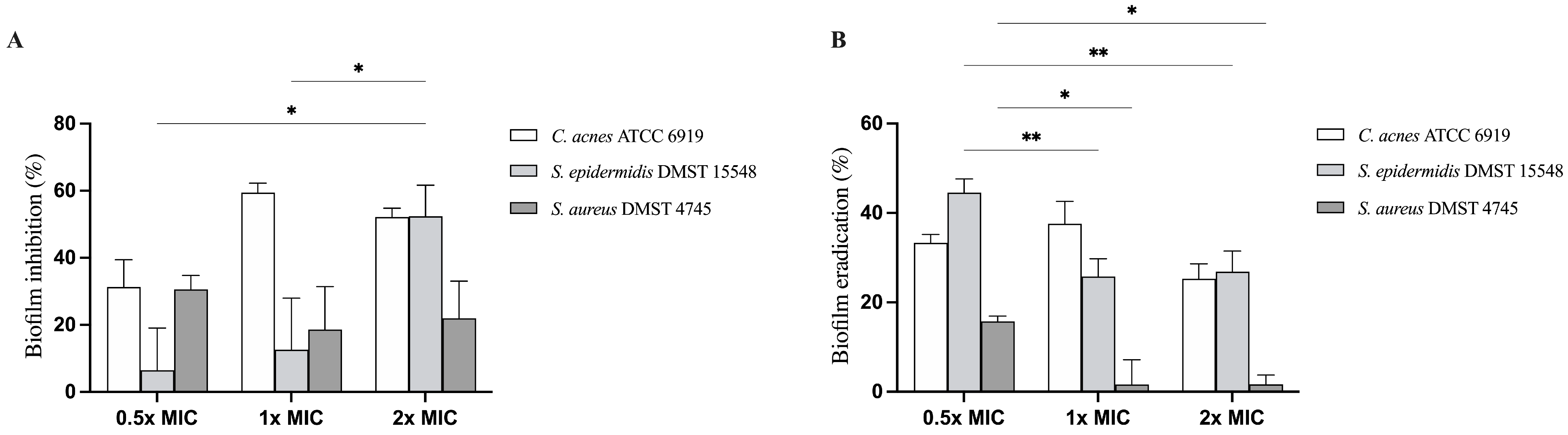| Cutibacterium acnes ATCC 6919 | Staphylococcus epidermidis DMST 15548 | Staphylococcus aureus DMST 4745 | ||||