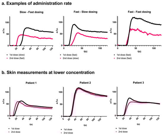 Effects of repeated injection and injection rate (panel (a)) or ICG concentration (panel (b)). (a) Three representative examples. Two consecutive measurements were conducted on the same parathyroid gland. A second dosing resulted in a lower Fmax. Slow injection resulted in a later peak onset compared to fast injection. Skin examples for ‘a’ can be found in Supplementary Information G. (b) Measurements were obtained in 3 patients after administration of freshly dissolved ICG at a concentration of 0.5 mg/mL. The perfusion curves for the two consecutive administrations were more comparable to each other than a concentration of 2.5 mg/mL.