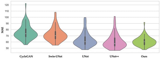 Violin plot of MAE across patients for CycleGAN, Swin-UNet, UNet, UNet++, and our proposed method. The distribution shows that our method not only achieves lower average MAE but also exhibits less inter-patient variance.
