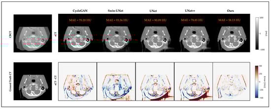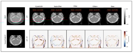 Qualitative comparison on a representative brain slice. Top: CBCT and sCT images generated by different models. Bottom: ground-truth CT and error maps compared to ground-truth CT.