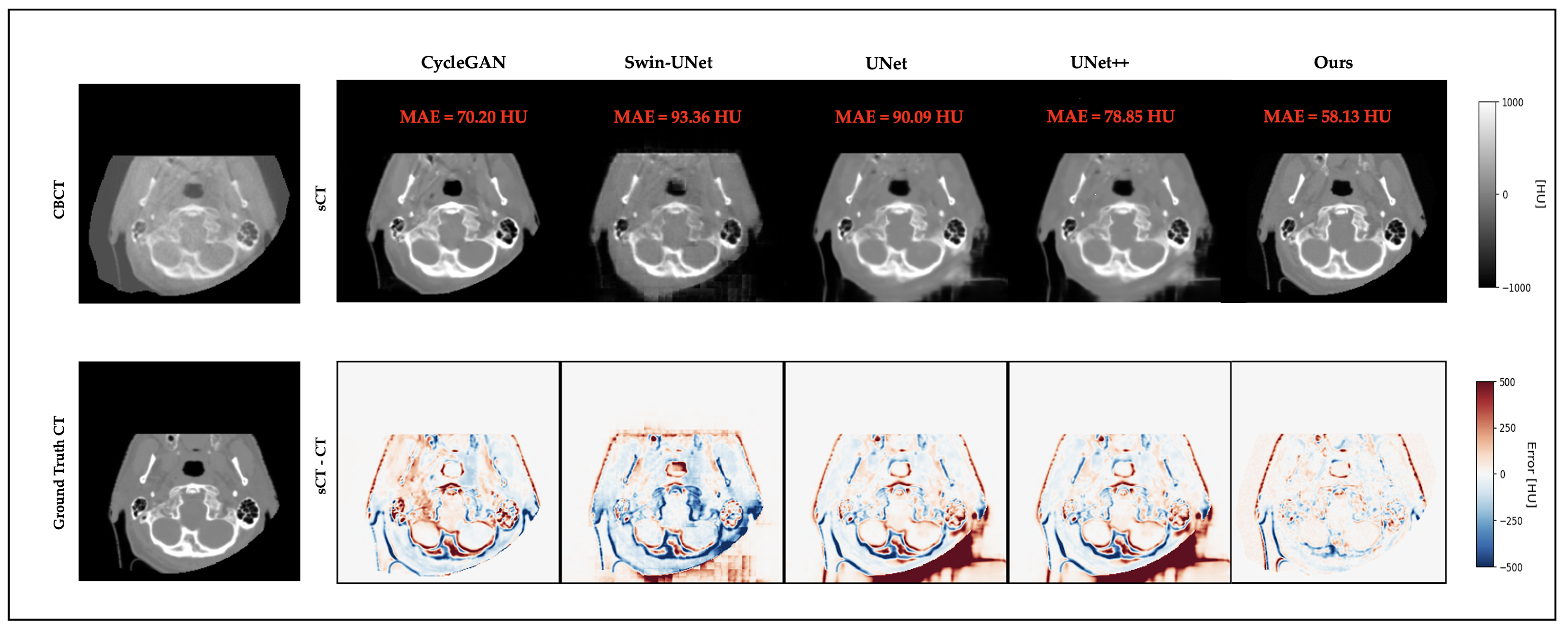 - Altalib, A.; McGregor, S.; Li, C.; Perelli, A. Synthetic CT Image Generation From CBCT: A Systematic Review. IEEE Trans. Radiat. Plasma Med. Sci. 2025, 9, 691–707. [Google Scholar] [CrossRef]