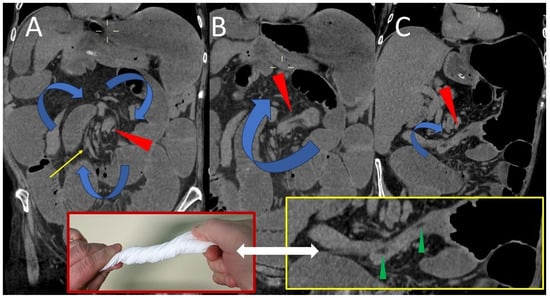 Coronal (A) CT image demonstrates a vortex composed of the cecum entangled on its longitudinal axis and a spiral of mesenteric vessels (yellow arrow) rotating consensually with the cecum: the “whirl” (red arrowhead). Seen along the longitudinal course, the entangled cecum (red arrowheads in (B,C)) contains small hypodense areas between its collapsed and intertwined walls, which represent mesenteric tissue incarcerated by the spiral braid of the cecal walls (green arrowheads in the yellow box).