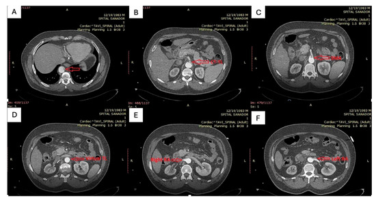 (A): Distal thoracic aorta with severely compressed true lumen; (B,C): Celiac trunk and superior mesenteric artery originating from the severely compressed true lumen; (D): severely compressed true lumen at the level of abdominal aorta; (E,F): Right renal artery perfused by the false lumen and left renal artery perfused by the true lumen.