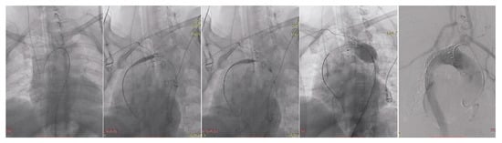 Under general anesthesia, vascular access was obtained via the right radial artery using a 5F sheath and via the right common femoral artery through a surgical cut-down with placement of a 7F sheath. The procedural steps are illustrated in Figure 4. A 5F pigtail catheter introduced through the right radial approach was advanced into the aortic arch to confirm accurate positioning within the true lumen using pressure waveform analysis. Through the right femoral access, a pigtail catheter was advanced into the ascending aorta, allowing visualization of the origins of the supra-aortic vessels by diagnostic aortography. A single-body wire technique was then performed, followed by wire reversal, with the C-arm positioned in a right posterior oblique projection to optimize delineation of the aortic arch anatomy.