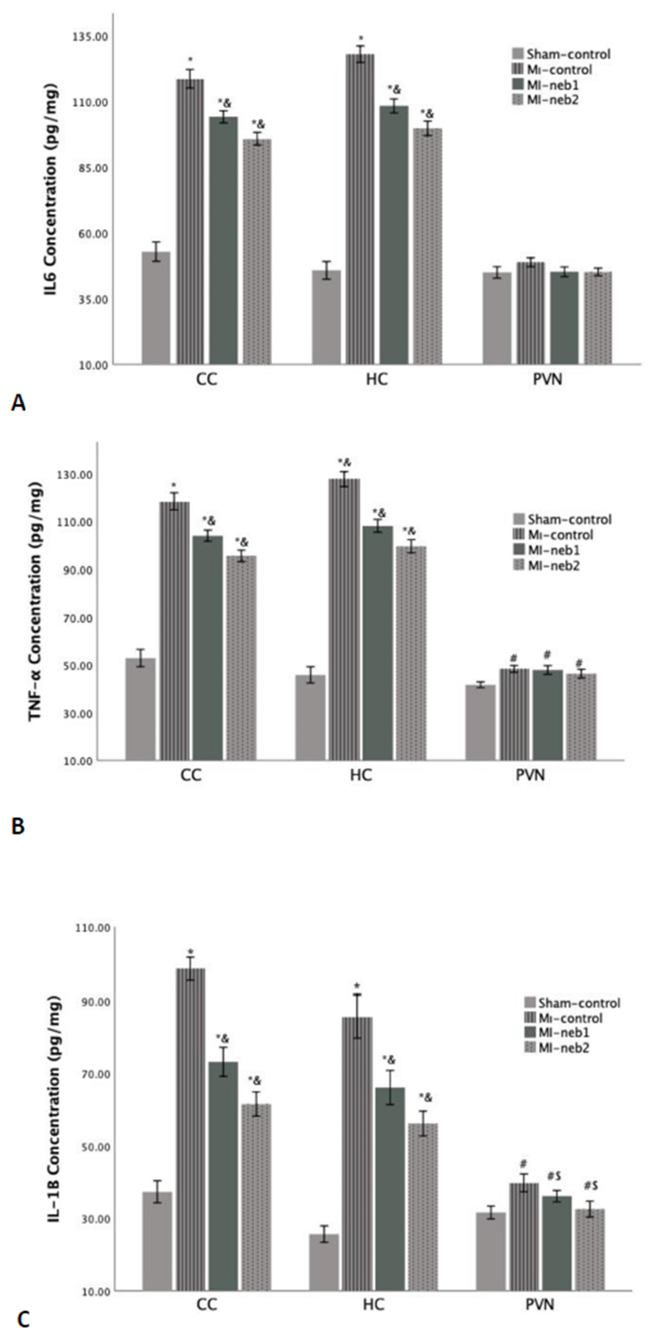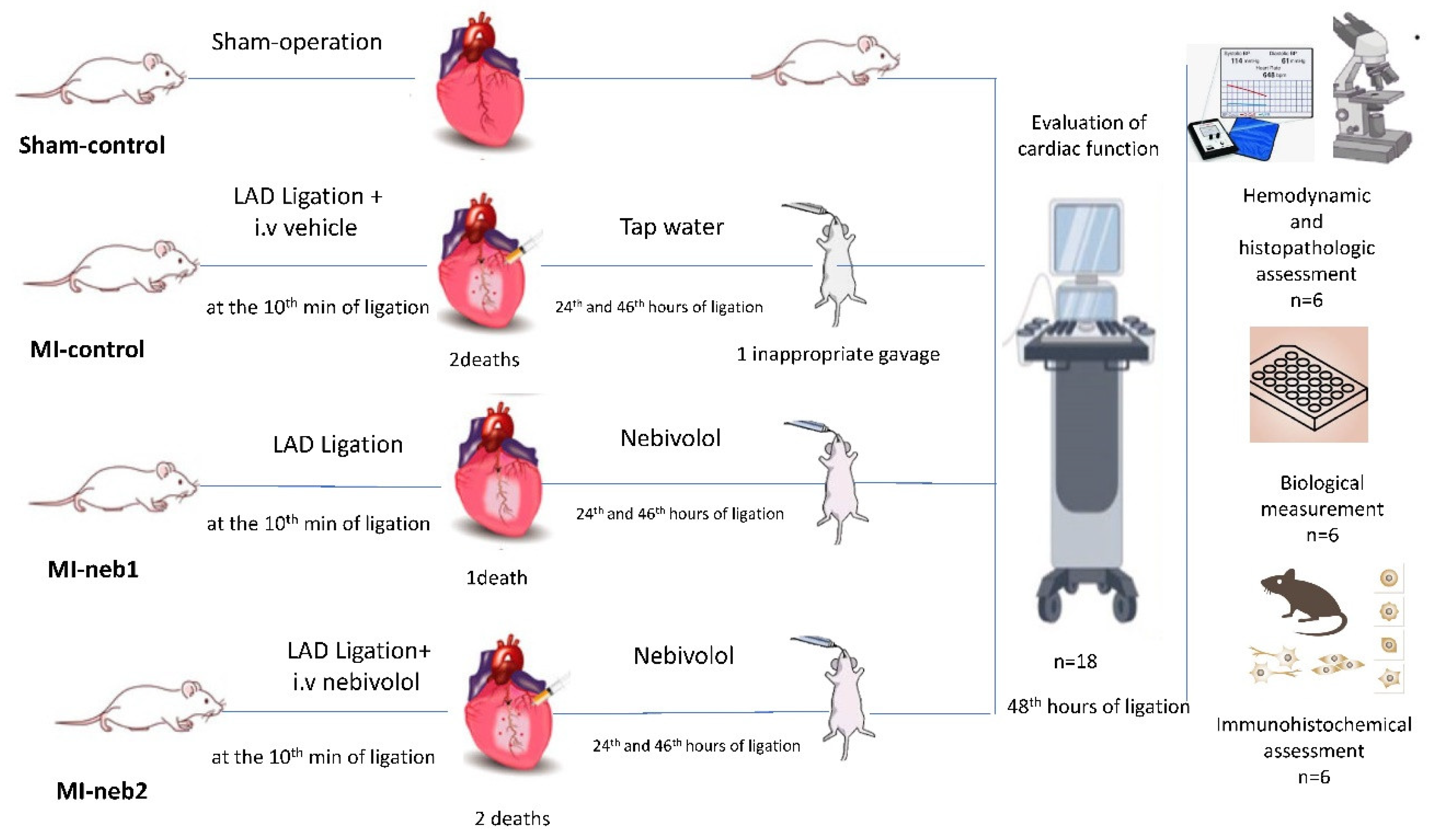 | Parameter | Sham-Control (n = 18) | MI-Control (n = 18) | MI-neb1 (n = 18) | MI-neb2 (n = 18) |