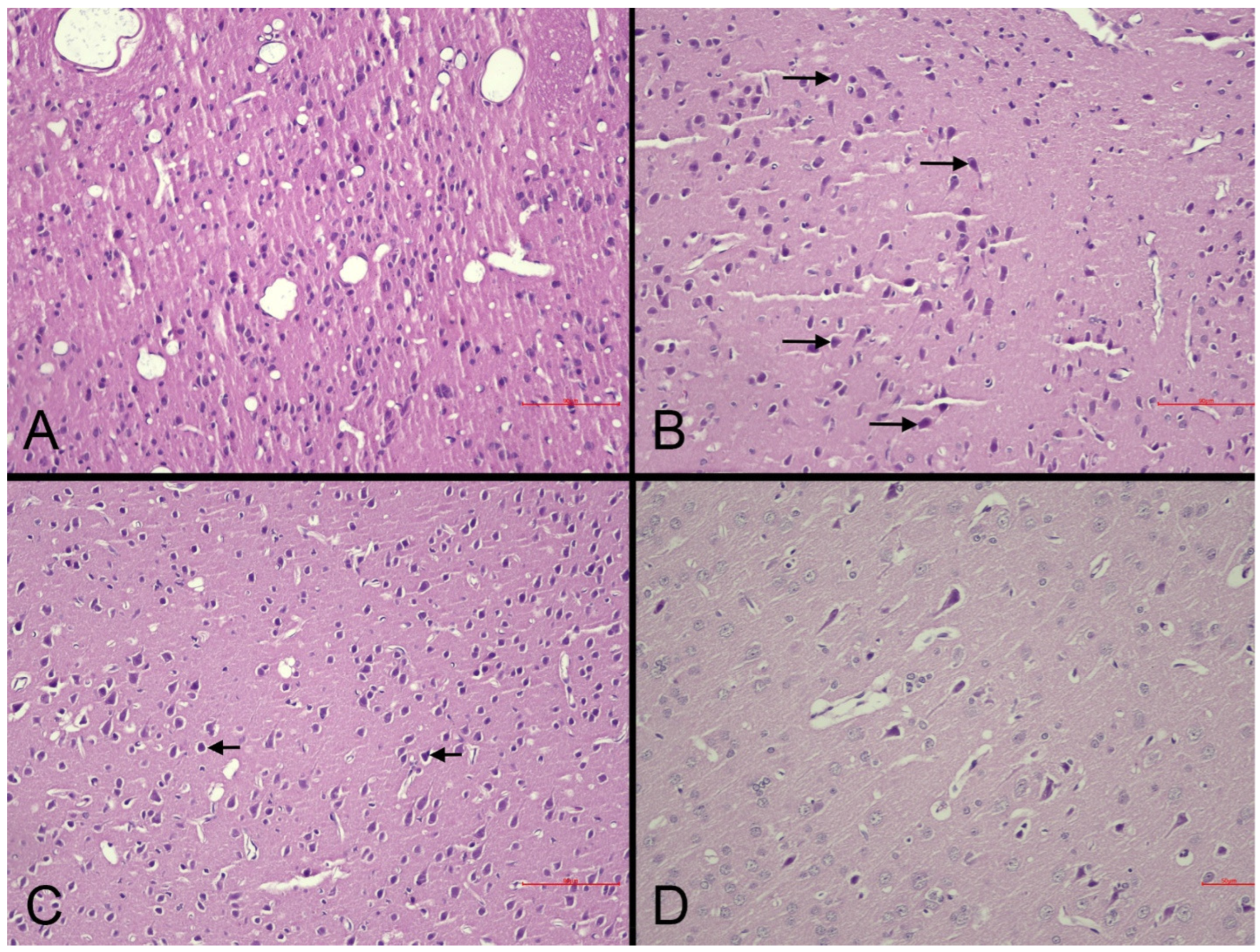 | Group (n = 6) | Necrosis | Astro Cytosis | Gliosis | Demyelination | ||