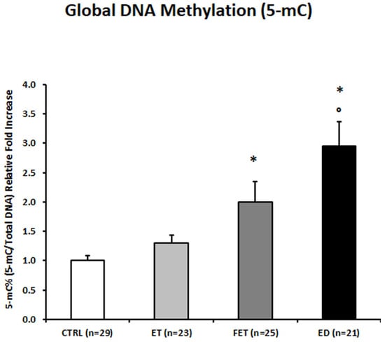5-mC% placental global DNA methylation in CTRL, FET, ET, and ED pregnancies. Significant differences (p ≤ 0.05): * significant compared with CTRL and ° significant compared with ET.