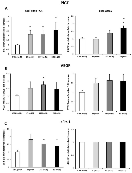 PlGF (A), VEGF (B), and sFlt-1 (C) gene and protein expression levels in CTRL, FET, ET, and ED pregnancies. Significant differences (p ≤ 0.05): * significant compared with CTRL and ° significant compared with ET.