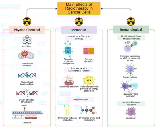 The administration of ionizing radiation to tissue causes direct damage to DNA by producing single-strand breaks, deletions, double-strand breaks, and indirect DNA damage due to the production of free radicals. This action leads to disruption of glucose transporters and enzymes involved in the glycolytic pathway, in addition to interference with mitochondrial function, thereby reinforcing cancer’s dependence on glycolysis for energy production. Moreover, radiation affects the production of essential fatty acids necessary for storing energy and amino acid metabolism, which are indispensable for cancer cells’ response to radiation. The metabolic effects of radiation ultimately modify the tumor microenvironment by increasing the expression of major histocompatibility complex (MHC) molecules on the tumor cell surface and releasing antigens, enabling cytotoxic T cells to easily recognize the tumor and activate an effective immune response, with subsequent cell death. The immune effects of radiotherapy synergize with additional therapies, such as CT and immunotherapy, to enhance the effectiveness of CC treatment. Created in BioRender. Flores, C. (2025) https://app.biorender.com/illustrations/67f6b86f3df04edb3a090179?slideId=a225dd13-e350-49da-80e7-3985b3c59de9.