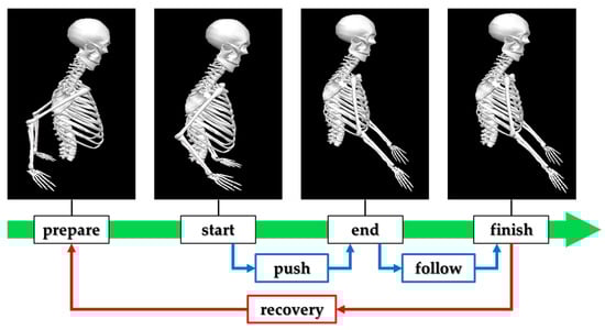 Upper-limb kinematics and surface EMG were processed using Visual 3D v6 Professional (HAS-Motion Inc., Kingston, ON, Canada; formerly C-Motion Inc., Germantown, MD, USA). An upper-limb model was created for each participant based on the recorded marker set. Before joint/segment analysis, marker trajectories were low-pass filtered with a fourth-order Butterworth filter at 6 Hz to reduce noise. Joint angles of the upper limb were then computed relative to the segment coordinate systems using an X–Y–Z Cardan sequence. For between-condition comparisons, task events and phases of the wheelchair propulsion cycle were defined as in Figure 2: prepare (the instant when the hand is at its most posterior position), start (initial hand–rim contact initiating the push), end (hand–rim release at the end of the push), and finish (the instant of maximal forward reach after push). The push phase was defined from start to end, the follow phase from end to finish, and the recovery phase from finish to prepare.