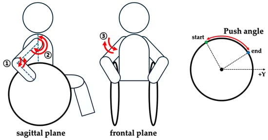 Understanding upper extremity joint patterns is crucial for preventing injuries in manual wheelchair users, including those with SCI. In particular, propulsion strategy analysis is a key component of rehabilitation for individuals with SCI [8]. Research on wheelchair design and biomechanics is essential to understanding propulsion mechanisms, how external and internal features of the musculoskeletal system interact, and strategies for maintaining the user’s joints [9]. Recently, there has been a rapid increase in interest in various elements of manual wheelchair propulsion methods to reduce the strain on upper extremity joints and muscles in manual wheelchair users and individuals with SCI. Knowledge of wheelchair propulsion data and trends can provide additional information for activity planning to prevent overuse injuries or for analyzing the outcomes of health-related interventions in the areas of activity and participation [10,11,12].