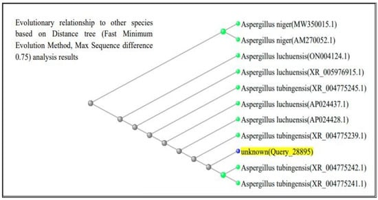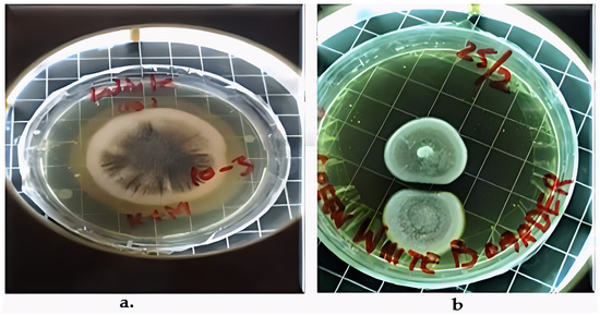 The plates were incubated under static conditions for 6–8 days at 28 °C. The reason for choosing this temperature is that mesophilic soil fungi typically thrive around 25 to 30 °C, and 28 °C is a typical compromise that allows for the best growth of environmental Aspergillus species as well as other rhizosphere fungi. Due to its ability to facilitate the sporulation and growth of a wide variety of soil fungus, Potato Dextrose Agar (PDA) (Thermo Scientific™ Oxoid™. CM0139B, Waltham, MA, USA) was employed. Static aerobic conditions were used for incubation, and the medium was treated with 50 µg/mL of chloramphenicol to promote fungal isolation over bacterial isolation. Pure cultures were produced by isolating the hyphal tips and repeatedly subculturing individual colonies onto new PDA. Prior to DNA extraction, uniform colony morphology and microscopic examination with lactophenol cotton blue were used to verify purity.