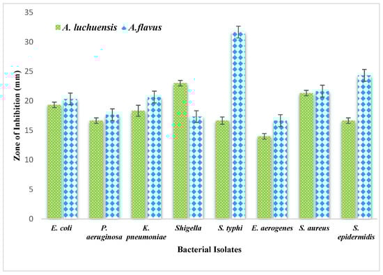 Crude extracts exhibited broad-spectrum antibacterial effects against multidrug-resistant clinical isolates, with inhibition zones up to 31.7 mm. Fungal secondary metabolites disrupt bacterial cell walls, inhibit protein synthesis, or induce oxidative stress [22]. The pronounced activity of A. flavus extracts against Salmonella typhi and Klebsiella pneumoniae underscores their potential as novel antimicrobials. At 100 µg/mL, both extracts suppressed L. minor growth by ~70%, indicating the presence of phytotoxic compounds that may interfere with photosynthetic pigments or hormone signaling. Fungal terpenoids and alkaloids are known to induce oxidative damage and growth inhibition in aquatic plants, suggesting potential for bioherbicide development [23,24,25,26]. Aspergillus luchuensis extracts caused 70% mortality in Blattodea and 40% in Isoptera at 100 µg/mL, outperforming A. flavus in certain assays. Fungal metabolites such as indole diterpenoids and tetramic acids target insect nervous systems or digestive enzymes [27,28,29,30], and species-specific efficacy suggests distinct metabolite spectra.