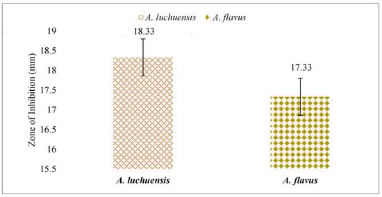 A comparative assessment of antifungal activity between A. luchuensis and A. flavus is presented. Both extracts showed inhibition against Candida albicans, with marginally higher efficacy observed for A. luchuensis.