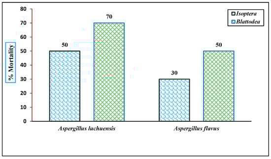 The insecticidal activity of fungal extracts is displayed against Isoptera and Blattodea. Mortality rates were recorded at 100 µg/mL after 24 h, with A. luchuensis showing higher efficacy across both insect taxa.