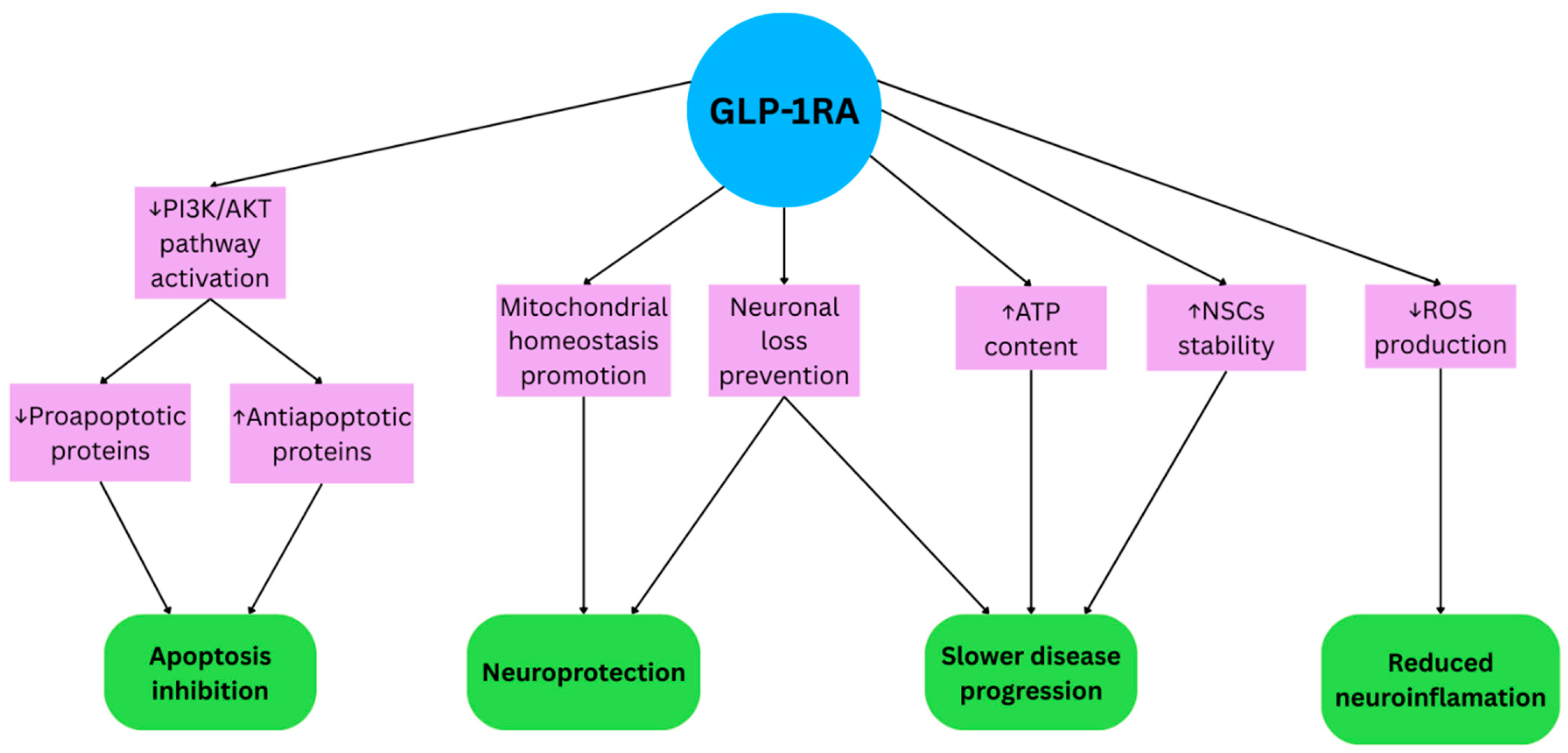 Pilśniak, J.; Węgrzynek-Gallina, J.; Bednarczyk, B.; Buczek, A.; Pilśniak, A.; Chmiela, T.; Jarosińska, A.; Siuda, J.; Holecki, M. The Role of Glucagon-like Peptide-1 Receptor Agonists in Alzheimer’s and Parkinson’s Disease: A Literature Review of Clinical Trials. Life 2025, 15, 1893. https://doi.org/10.3390/life15121893