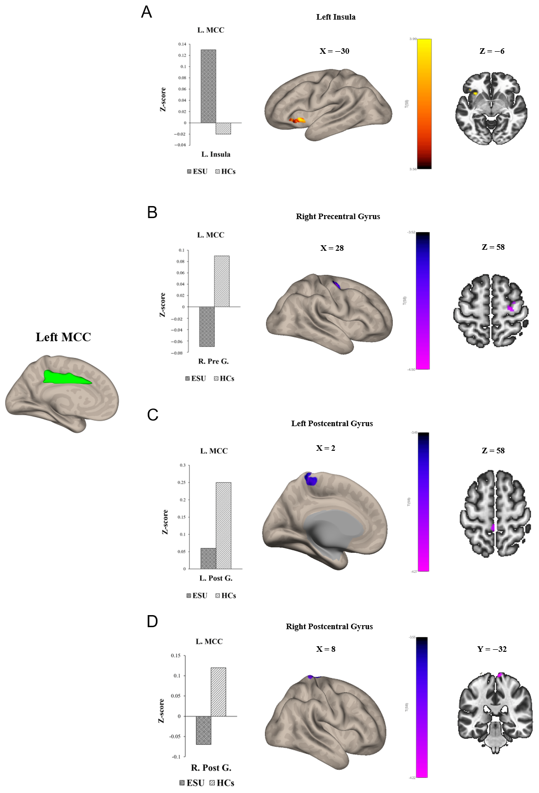 | L. Postcentral Gyrus | 02 | −36 | 60 | 5.36 | 208 | ESU<HC | <0.001 | 0.33 | |