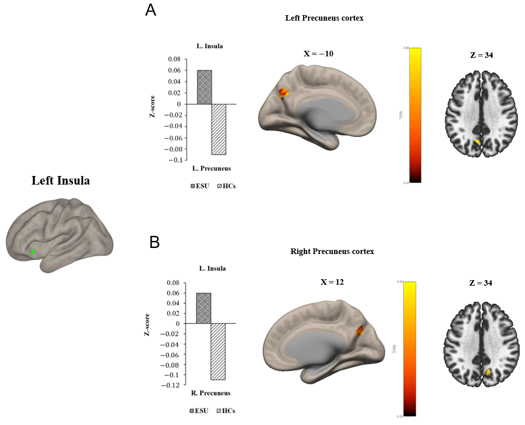 | L. Insula | −30 | 18 | −04 | 5.83 | 66 | ESU>HC | <0.001 | 0.33 | |